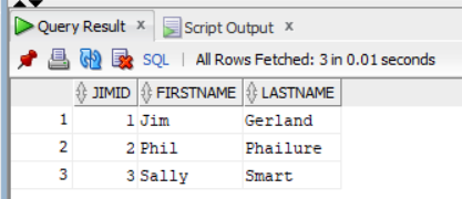 INSERT INTO jimTable (jimID, firstName, lastName) VALUES (1, 'Jim', 'Gerland'); INSERT INTO jimTable (jimID, firstName, lastName) VALUES (2, 'Phil', 'Phailure'); INSERT INTO jimTable (jimID, firstName, lastName) VALUES (3, 'Sally', 'Smart'); 1 row inserted. 1 row inserted. 1 row inserted.